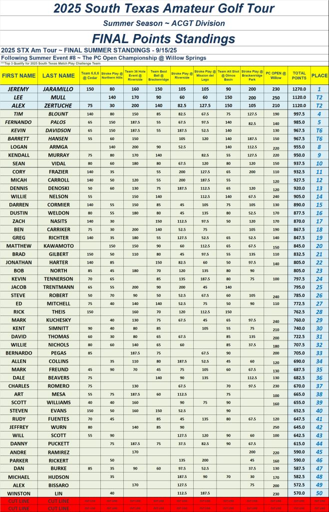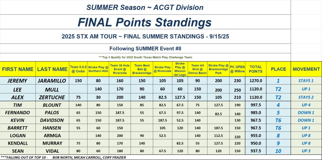 ARCHIVE - 2025 STX AM TOUR ~ ACGT DIVISION ~ SUMMER POINT STANDINGS